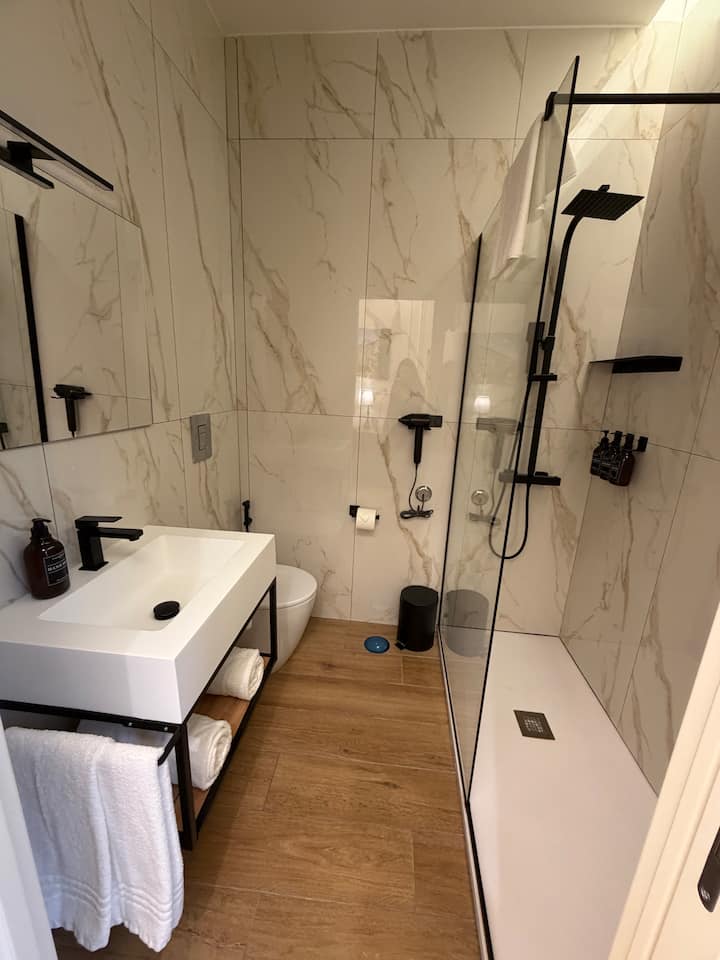 Dekori është minimalist, por i mirëmbajtur, me detaje funksionale dhe produkte të kujdesit personal të ofruara (shampo, balsam, sapun, xhel dushi).