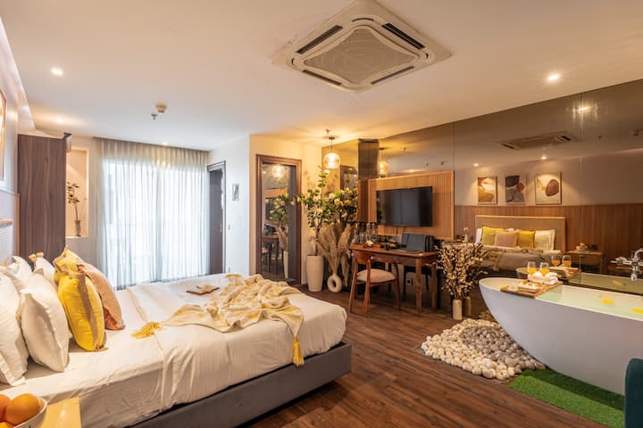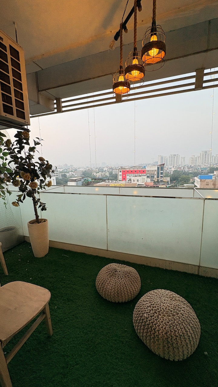 Krevati dopio "king", i veshur me çarçafë të pastër që i ndërrojmë çdo ditë, të fton të zhytesh në të. Përveç kësaj, perdet e holla lëvizin drejt një ballkoni të larë në muzgun e artë, ku mund të pish kafe, të shikosh qytetin të qetësohet ose thjesht të dëgjosh ajrin të lëvizë nëpër Gurgaon.