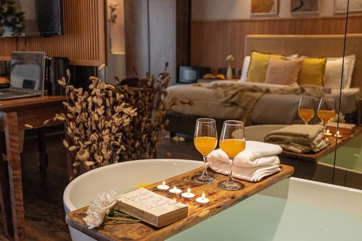 Në zemër të këtij apartamenti qëndron shpirti i tij: një vaskë e rrethuar nga gurë të lëmuar, të gërryer nga lumi, të ngrohtë në prekje dhe që të presin. Ndërsa avulli ngrihet, ai mbart aromën e vaniljes dhe bergamotit, duke u përkulur butësisht kundër reflektimit të pasqyrës. Nuk është thjesht një banjë, është një pauzë, një vend ku mendimet shpalosen dhe lundrojnë. Ndiz një qiri. Lëre tingullin e ujit të zëvendësojë çdo mendim të papërfunduar.