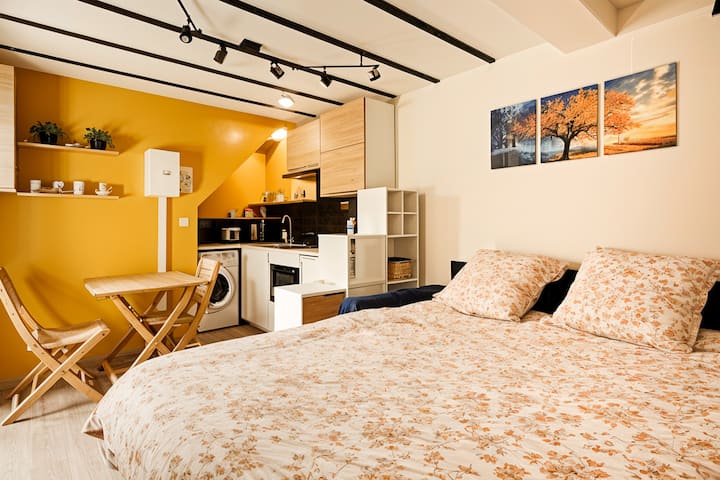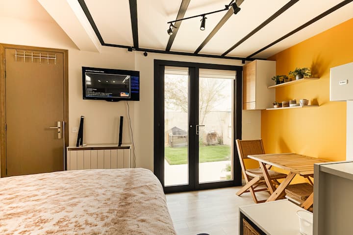 E vendosur në një shtëpi të vogël në fund të një oborri të pyllëzuar, kjo studio e rinovuar plotësisht të garanton qetësi, privatësi dhe autonomi.