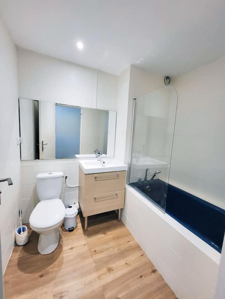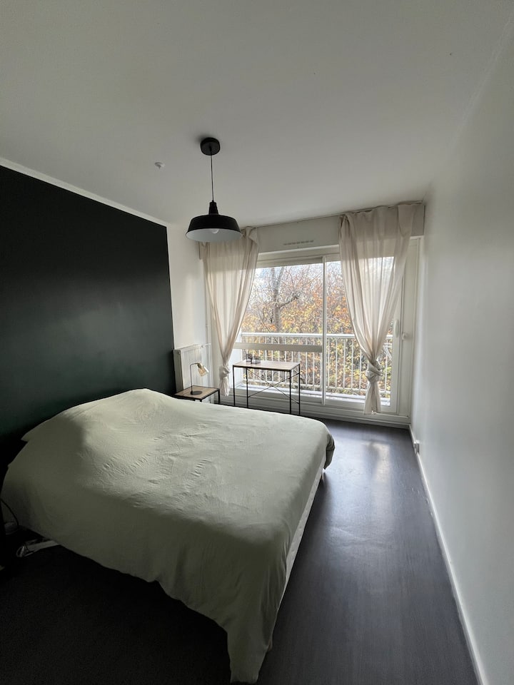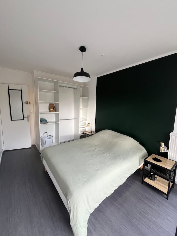 Vendos në një dhomë gjumi private të ndritshme dhe të mobiluar plotësisht brenda një apartamenti të përbashkët të ri dhe miqësor, i vendosur në mënyrë ideale në Lormont, vetëm disa minuta nga Bordeaux.