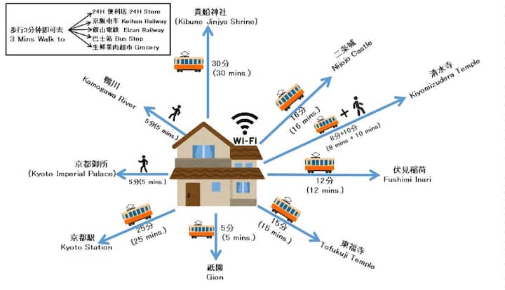Rreth 10 minuta më këmbë, rreth 10 minuta më këmbë, që ndodhet në Stacionin Demachiyanagi dhe Stacionin e Metrosë Imadegawa, transport i përshtatshëm, në lindje është Kopshti Kombëtar Kyoto Gyoen në anën perëndimore të Kopshtit Kombëtar Kyoto Gyoen, Metro 2 Station Road, rreth 10 minuta më këmbë. Në veri, faltorja Shijo Shogyo është rreth 8 minuta më këmbë.