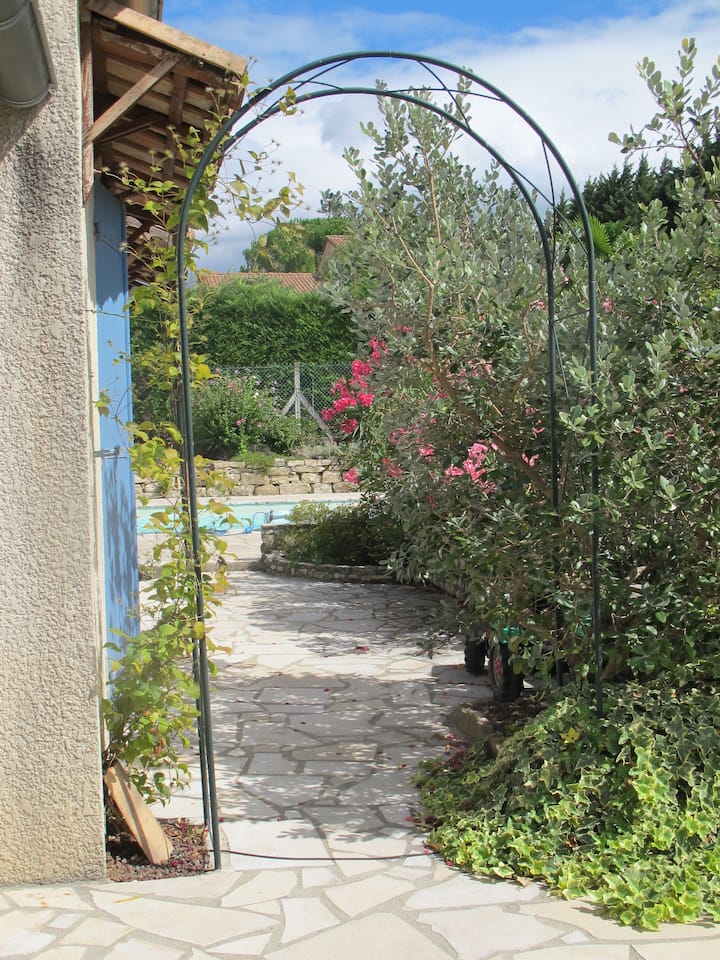 Vilë në një nivel me kopsht dhe pishinë