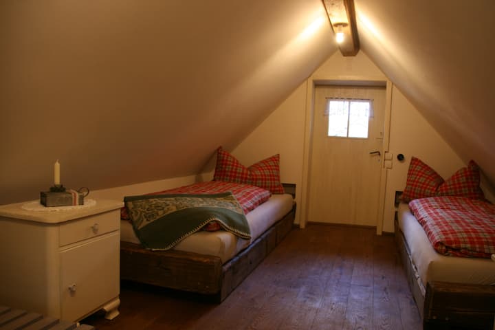 Das Backhaus bietet Ihnen Platz für 2 Personen. Sie heizen das Häuslein, die Sauna und den Badezuber selbst mit Holzfeuerung ein ( diese Leistung kann vor Ort als Option zugebucht werden). Die Toilette ist im traditionellen Holzhäuschen neben dem Backhaus. Dusche und Badezuber sind im Freien. Im Obergeschoss, das über eine Außentreppe zugänglich ist, wird geschlafen Im Erdgeschoss sind Küche und Wohnstube.