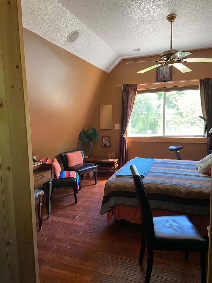 KI parasysh: Një suitë beqarie e pajisur plotësisht në nivelin e tokës me qasje të veçantë private është e disponueshme me qira në kombinim me këtë listim për privatësinë e suitës së 2-të {shko te listimi "2 Suite Upscale Loft në parajsën e pyllit prej 14 hektarësh"} me 2 banjë/lavanderi dhe dhomë të veçantë me një dush të madh me pllaka porcelani me dhomë të lagur të ngjyrosur, një dhomë gjumi/zyrë/zyrë/kuzhinë verore me kabinet të gjerë dhe të fshehur në dollapin Murphy Bed. Dritaret e mëdha dhe dyert e oborrit të kopshtit francez ofrojnë pamje ftuese dhe qasje të drejtpërdrejtë në oborrin e pasmë, pyllin, përroin dhe pellgun me kalldrëm dhe oborrin e madh të mbuluar pranë pishinës me barbekju të madhe inoksi dhe akses në verandën e mesme të pishinës. Zona e mbuluar e oborrit prej betoni me ventilatorë tavani, drita dhe skarë të madhe me propan prej çeliku inox. Përafërsisht 100 metra katrorë. Kuvertë e nivelit të mesëm për hyrjen në pishinë mbi tokë dhe pranë pishinës. Përafërsisht 440 sq ft. kuvertë e nivelit të sipërm me tendë të motorizuar të tërheqshme. Loungers dhe bistro grupe për të tre nivelet. Nëse jeni të interesuar të merrni me qira të dyja njësitë, ju lutemi shihni listimin me titull "2 Suite Upscale Loft 14 acre parajsë pyjore" ose na kontaktoni. Faleminderit.