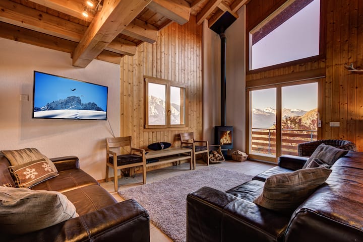 Pikat e fituara ' t të zhgënjeheni kur hyni brenda këtij chalet të mrekullueshëm, me dritaret e saj të mëdha panoramike dhe pamjet e hedhjes së nofullave mbi luginën dhe malet përtej. Dhoma gjumi & Banja imeKjo chalet me pesë dhoma gjumi është ideale për 12 të rritur ose mund të flenë deri në 14 kur përdorni shtretërit në mezzanine të hapur.