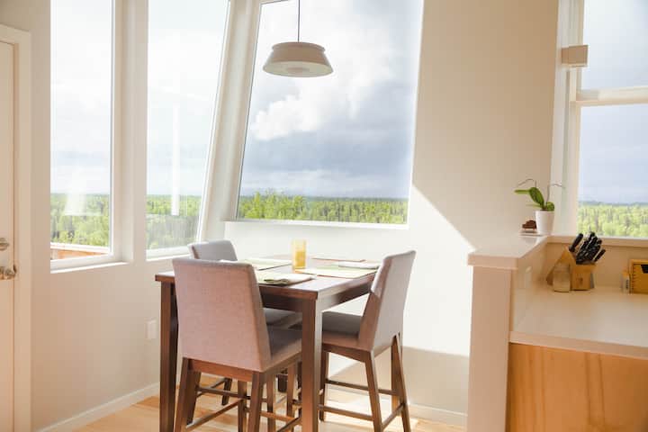Kur po ndërtoja shtëpinë time, doja të krijoja një hapësirë që më dha këtë përvojë. Pamjet, dritaret e mëdha dhe dizajni i pastër skandinav nxjerrin në pah natyrën. Drita e ndryshueshme, pamjet dhe moti është një kanavacë gjithnjë në ndryshim që të tërheq. Duke parë mbi Twister Creek, përtej shkretëtirës së pandërprerë, në vargmalin e Alaskës që shtrihet nëpër horizont, të qetëson shpirtin. Koha ngadalësohet. Frymat bëhen më të thella.