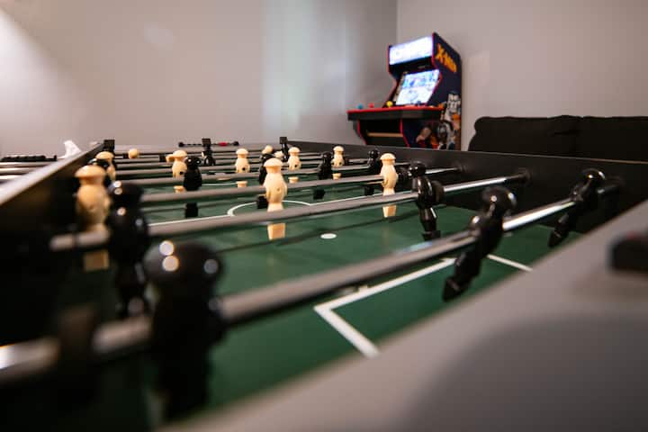 Familje, kafshë shtëpiake, kafe, arkadë, foosball, gropë zjarri