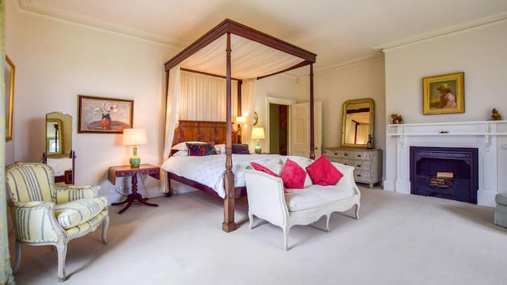 Dhoma luksoze e gjumit master përmban një krevat të mrekullueshëm me katër postera dhe një dritare të bukur të gjirit me pamje nga parku dhe më gjerë. Është aq e gjerë sa kjo dhomë gjumi, me raste, ka qenë e njohur për të fjetur nëntë shoqëruese të nuses së bashku me një nuse… është kaq e madhe! E mobiluar me një djalë të gjatë, dy kolltuqe, një divan të stilit Regency, një tavolinë të madhe (në dritaren e gjirit), me një karrige dhe abazhur, një arkë të madhe me sirtarë me një pasqyrë dhe një oxhak origjinal (dekorativ). Hapësira e varur për vizitorët në dhomën kryesore të gjumit është e disponueshme në dollapin e uljes jashtë dhomës së gjumit. (7.61 x 6.35m)