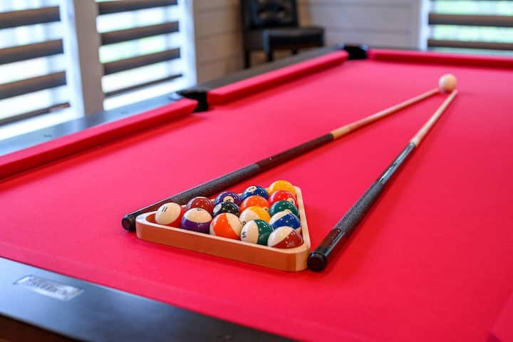Tavolinë bilardoje me ngjyrë të kuqe luleshtrydheje, set i personalizuar me shilarës,EV C