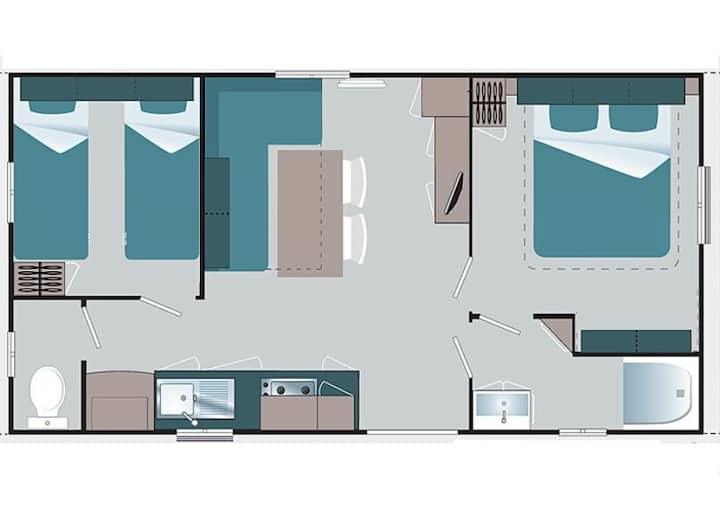 Mobilo banesën 3 dhoma për 4/6 persona me sipërfaqe rreth 28m2 me :