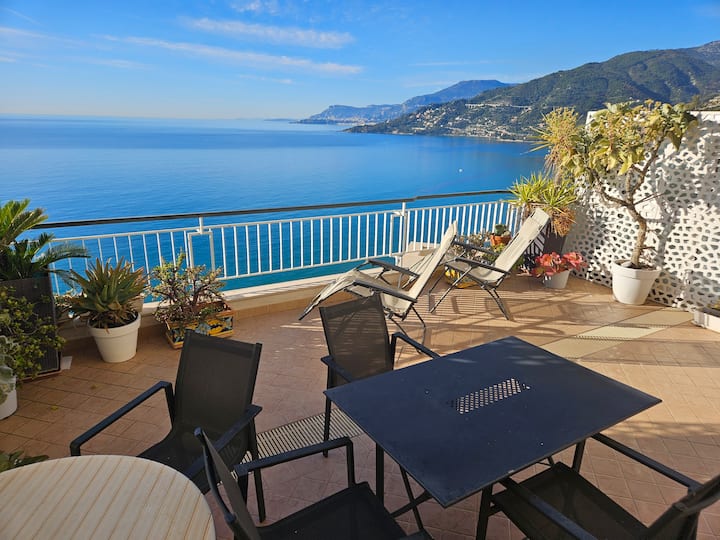 Apartament ekskluziv me hapësirë të bollshme me ashensor, tarracë e madhe me pamje mahnitëse të Côte d'Azur dhe Monaco. Pamja dhe atmosfera janë unike. Dhomë gjumi e madhe dyshe me pamje të bukur nga deti dhe ballkon. Do të ndihesh në një varkë! E ekspozuar në jug, ajo gëzon një mikroklimë të butë gjatë gjithë vitit. Hyrje e drejtpërdrejtë në plazhin me rërë të artë të Calandre. Ndodhet 300m nga fshati mesjetar i Ventimiglia Alta dhe 7 km nga Riviera franceze.