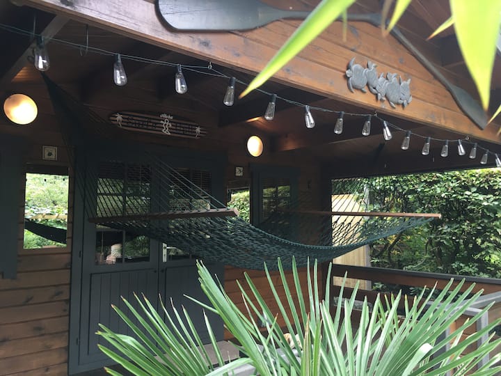 Kabinë e rehatshme magjepsëse me verandë dhe oborr.