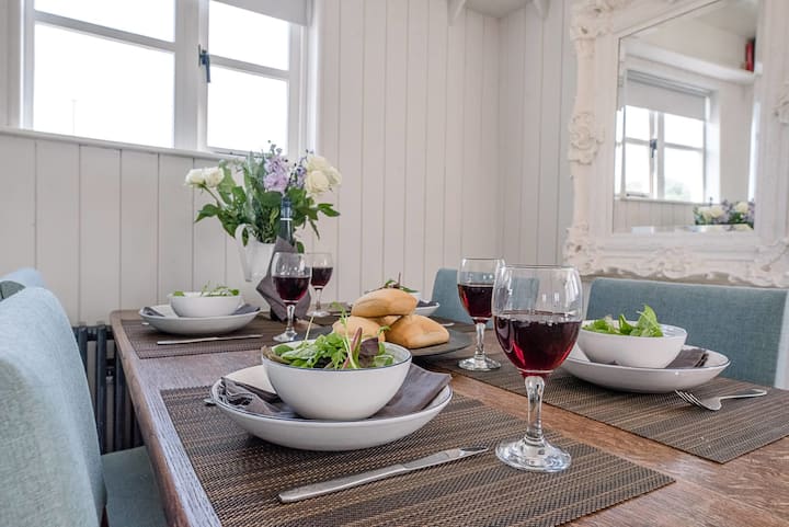 Pamjet e anijeve dhe lumit Deben mund të shijohen përmes dritareve në tre anët e kësaj dhome të bukur, të zbukuruara me gri të bardha dhe të zbehta, me mure me gjuhë dhe brazdë ose dërrasa që të kujtojnë origjinën e saj. Zhytu përsëri në divanin masiv ose në karriget e rehatshme dhe vendos këmbët mbi osmanin e veshur me susta; darko në tavolinën e fortë të lisit me pesë karrige të veshura me susta; akordohu në televizor ose Bose për pak argëtim ose zgjidh një nga librat interesantë jashtë raftit.
