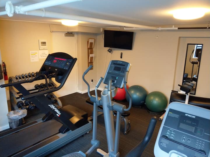 Gati për t'u stërvitur me pistë vrapimi, biçikletë statike dhe pesha për stërvitje.