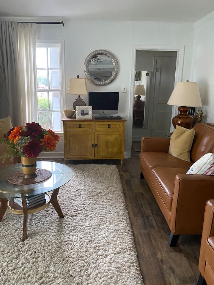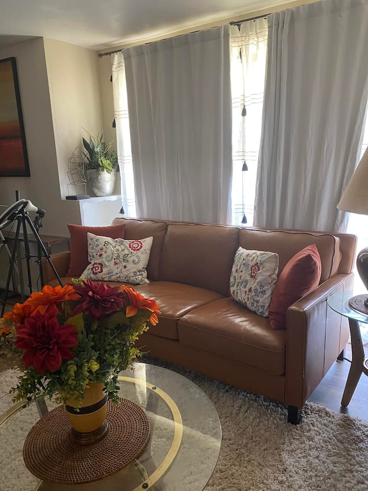 Kemi një dhomë ndenjjeje të mobiluar me shije me një ambient të qetë ku mund të ngresh këmbët dhe të lexosh një libër, të shikosh një film, të punosh. Kemi perde të rënda për bllokimin e nxehtësisë, dysheme të bukur prej druri të fortë të instaluar rishtas, shumë libra dhe revista për lexim! Wifi ofrohet me kosto shtesë. Ajër qendror (A/C) me ngrohës ambienti/ventilator për rehati shtesë. Kontrollo me hostin se çfarë përfshihet.