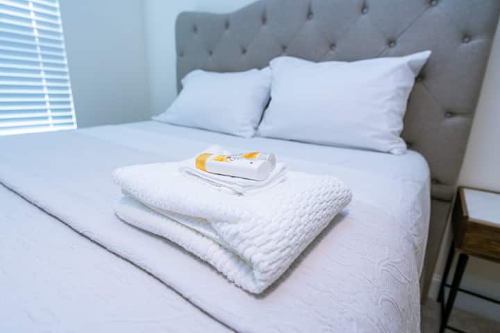 Dhomë gjumi e pastër me krevat dopio "king", banjë private dhe hapësirë pune