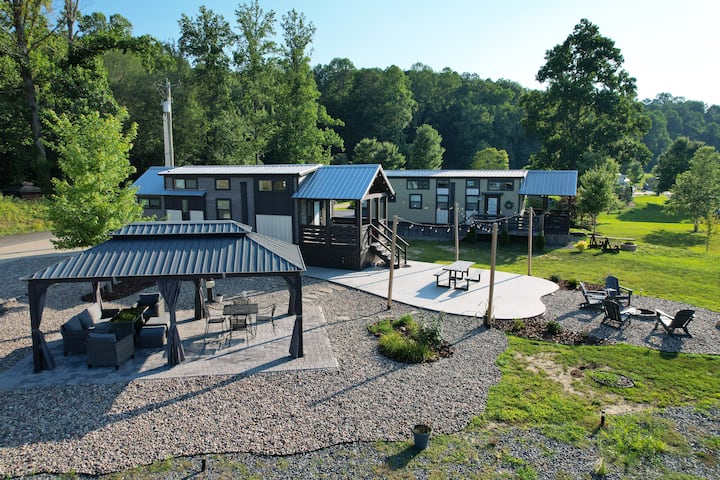 Pamje të rehatshme të shtëpisë, oborr dhe gropë zjarri në Blue Ridge