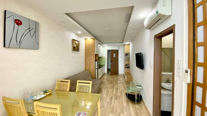 Apartamenti është i pajisur plotësisht: kuzhinë, enë kuzhine, mikrovalë, frigorifer, ibrik me super shpejtësi, tenxhere me oriz, lavatriçe, ujë të nxehtë dhe të ftohtë, televizor, kondicioner,...