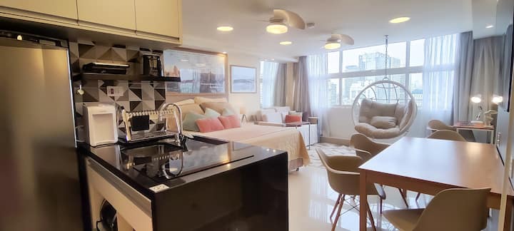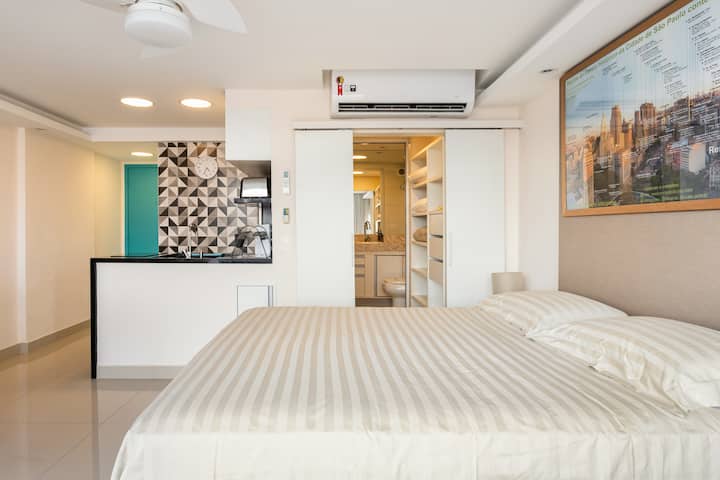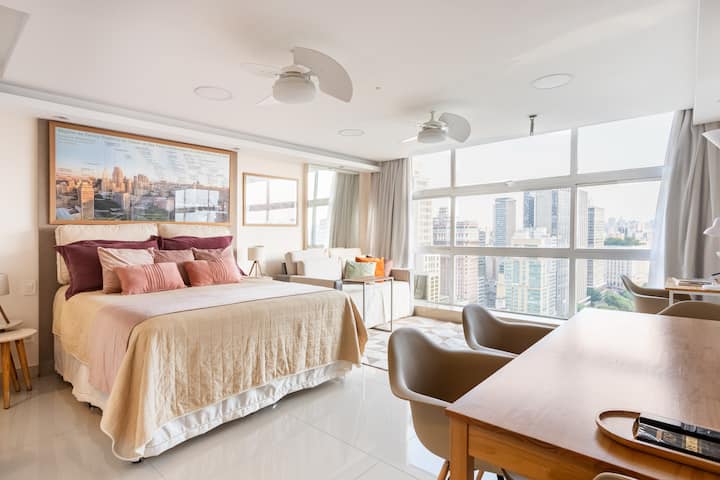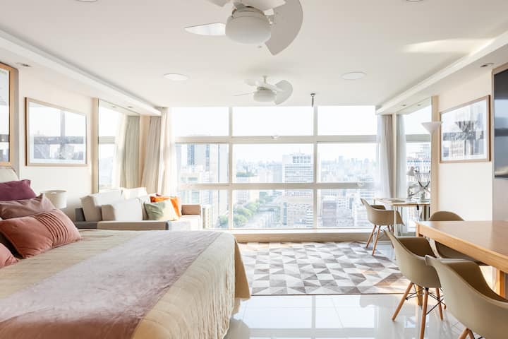 Hapësirat u projektuan me kujdes nga akademikët e arkitekturës dhe dizajnit (gjithashtu ekspertë në hartimin e shërbimit) në mënyrë që të siguronin, me rehati dhe funksionalitet të madh, një mjedis të favorshëm për të punuar në modalitetin e "zyrës në shtëpi", ose për momente pushimi dhe meditimi të një prej pamjeve më portreti të qytetit! Ajër i kondicionuar super efikas prej 24,000 BTU. Shtrojat e krevatit dhe të banjës, me cilësi të lartë, ofrohen në paketime individuale të mbyllura. Ngjyrat dhe pëlhurat e shtrojave të krevatit dhe jastëkëve të dekorimit mund të ndryshojnë, në mënyrë delikate, midis një rezervimi dhe një tjetri, jo domosdoshmërisht korrespondojnë, saktësisht me të njëjtat artikuj të ilustruar në një nga disa fotografitë e listimit, por duke respektuar gjithmonë të njëjtën grafik ngjyrash të dekorimit dhe cilësisë së syzeve që u ofrohen vizitorëve tanë!