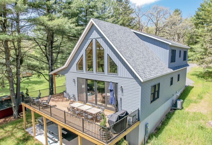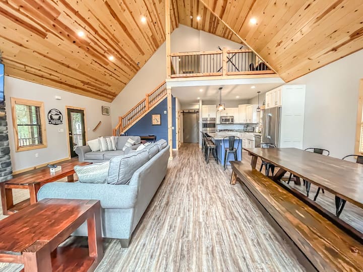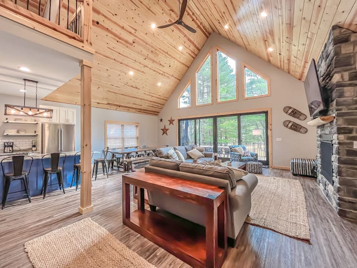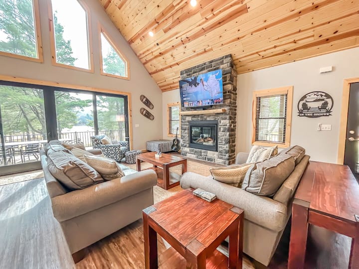 Brenda shtëpisë, do të gjesh shërbime bollëk! Në katin kryesor të dhomës së madhe, shijo dizajnin mahnitës të tavanit me pisha të harkuar, dritareve nga dyshemeja në tavan dhe dyert e mëdha rrëshqitëse prej xhami që hapen në verandën e gjerë përreth me pamje të mrekullueshme nga liqeni. Oxhaku me gaz, divanet prej pelushi, televizori i madh inteligjent 75"me kabllo dhe tavolina e ngrënies e ndërtuar me porosi prej 10 metrash rrethojnë hapësirën me të gjitha shërbimet që të duhen për t 'i argëtuar të gjithë.