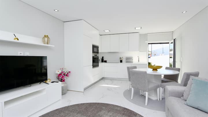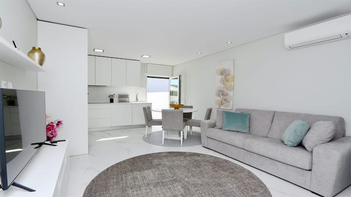 Dhoma e ndenjjes/ngrënies: divan-krevat, tavolinë ngrënieje me 4 karrige, Smart TV me ekran të sheshtë me Netflix, ajër të kondicionuar, qasje në tarracë.