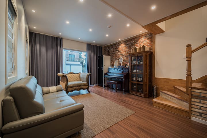 Dhomë ndenjjeje, kuzhinë me vetëshërbim dhe banjë në katin e parë