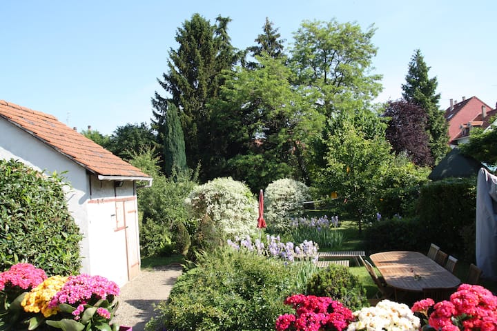 Tarraca me mobiliet e saj marquise, balustrade dhe hekurosje ofron një hapësirë çlodhëse. Kopshti është një parajsë e vërtetë paqeje, e përbërë nga tridhjetë varietete bimore ku mund të shijoni tryezën e tij miqësore (me zgjatje 12 persona dhe karrige), zonën e saj të lojës (lojëra të ndryshme me top) dhe kopshtin e saj të perimeve.