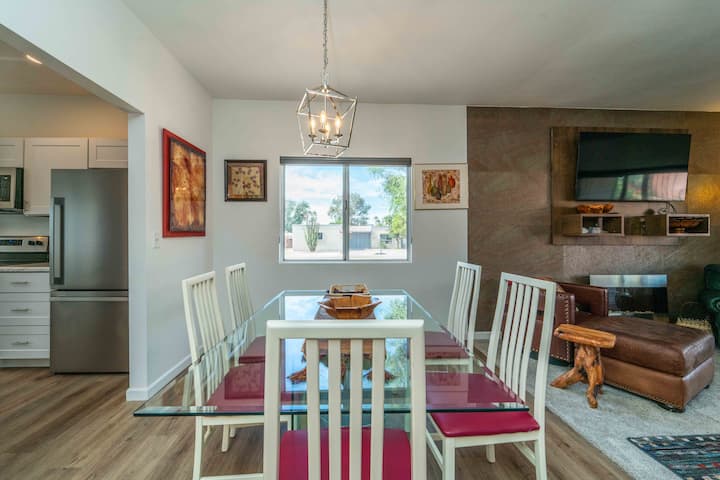 Lejo veten të hysh në shtëpi me kodin tënd personal të çelësit dhe të hysh në zonën e bollshme të ndenjjes, me një çati të madhe. Në murin në të majtë të derës kryesore, është një raft muri me kartat kryesore të pishinës së komunitetit, top me lopata, shtëpisë së klubit, palestrës së vogël, këpucëve të kuajve, shuffleboard dhe një unazë basketbolli. Drejt përpara është dhoma e ndenjjes dhe pas kësaj, një dhomë me hapësirë të bollshme në Arizona. Një kuzhinë plotësisht e aksesuar është në të majtë, me të gjitha pajisjet e kuzhinës, duke përfshirë furrën me mikrovalë, thekëse buke, blender dhe aparat kafeje Kurig. Sigurisht, edhe pajisjet e mëdha (frigorifer, sobë/furrë dhe enëlarëse)janë këtu. Kuzhina është e pajisur plotësisht me artikuj tavoline dhe artikuj gatimi, si dhe një numër ushqimesh për përdorimin tënd. Edhe dritaret në kuzhinë duken nga malet!