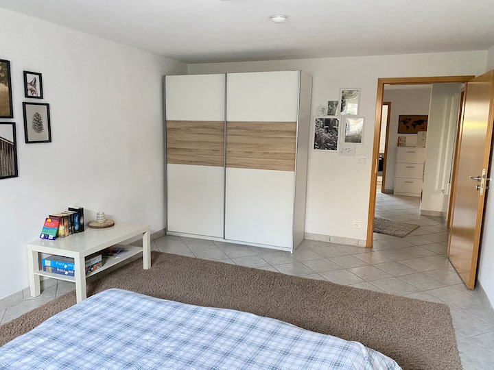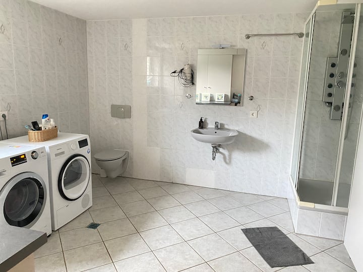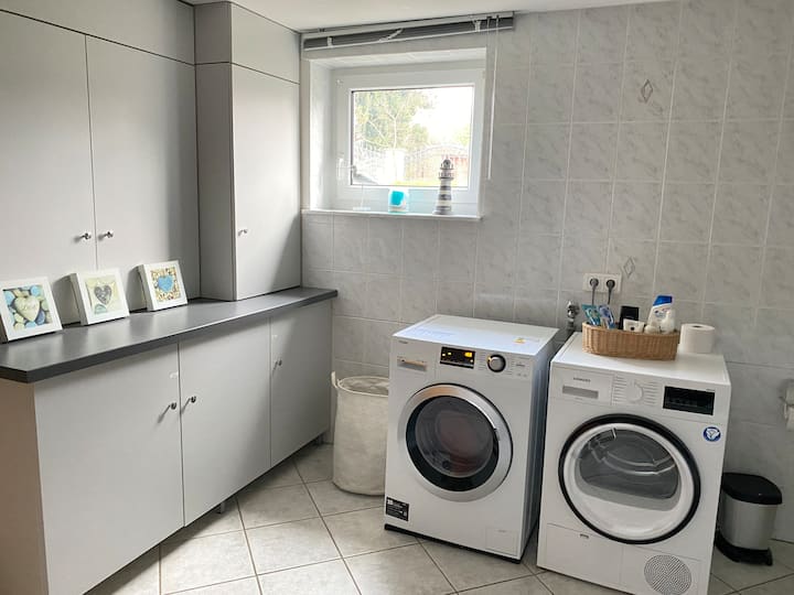 Meqenëse shtëpia jonë nuk është ende plotësisht e banuar nga ne, ne jemi gjithashtu pritës dhe japim me qira bodrumin e shndërruar si apartament për vizitorë.