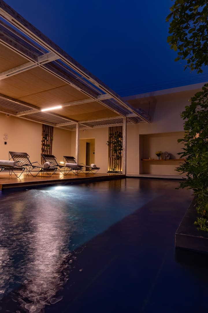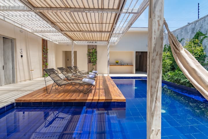 Jemi të sigurt se do të të pëlqejë ky apartament unik në zemër të qendrës historike të Santa Martës. Vendosur në një nga shtëpitë më të bukura koloniale të qytetit, ai përzien historinë dhe dizajnin me rehatinë moderne: një pishinë e përbashkët e rrethuar nga gjelbërimi i harlisur, hamakë, një kuzhinë e pajisur plotësisht, ajër i kondicionuar dhe Wi-Fi me shpejtësi të lartë. Vetëm disa hapa nga Parque Bolívar, shëtitorja dhe restorantet më të mira, kjo oazë në stil mesdhetar të fton të përjetosh Karaibet me qetësi dhe stil.