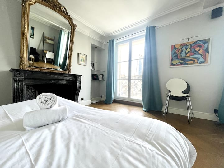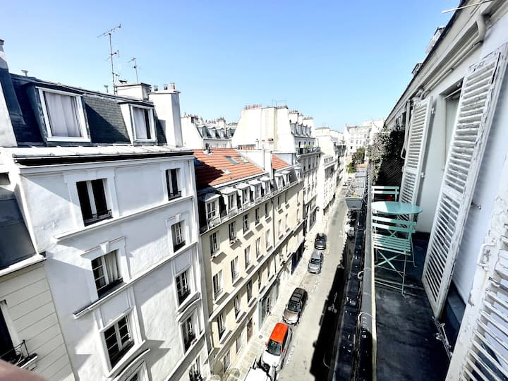 Le të kthehemi në vetë apartamentin tani. Ballkoni, i cili shkon përgjatë gjithë gjatësisë së apartamentit, ka pamje të papenguar mbi çatitë pariziane. Edhe me dritaret e hapura, do të ruhet çuditërisht nga zhurma e qytetit, duke krijuar një strehë të vërtetë paqeje në zemër të Parisit. Një tavolinë e vogël për dy persona ju lejon të pini kafe në mëngjes ose një kafe alfresko ndërsa shijoni pamjen.