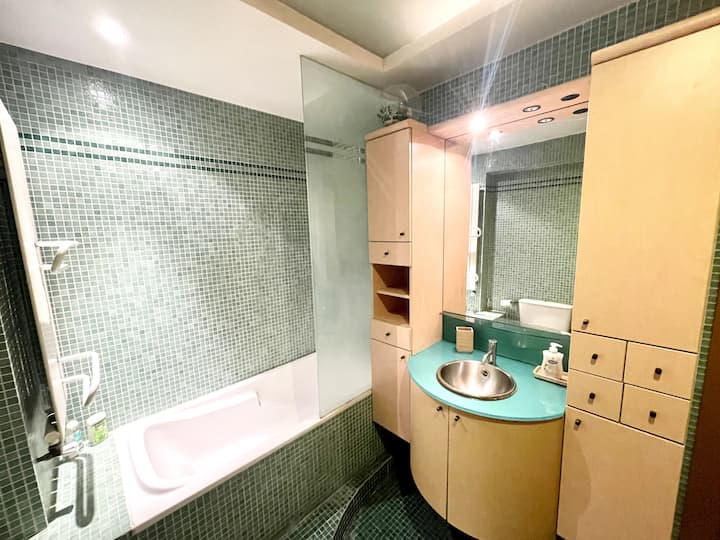 Banja e madhe është një tjetër pasuri e këtij apartamenti. Është e pajisur me një vaskë për t 'u çlodhur pas një dite të ngarkuar duke eksploruar qytetin. Përveç kësaj, gardëroba e dyfishtë dhe sirtarët e shumtë ofrojnë hapësirë të mjaftueshme magazinimi për rrobat dhe sendet tuaja, duke ju bërë të ndiheni si në shtëpi.