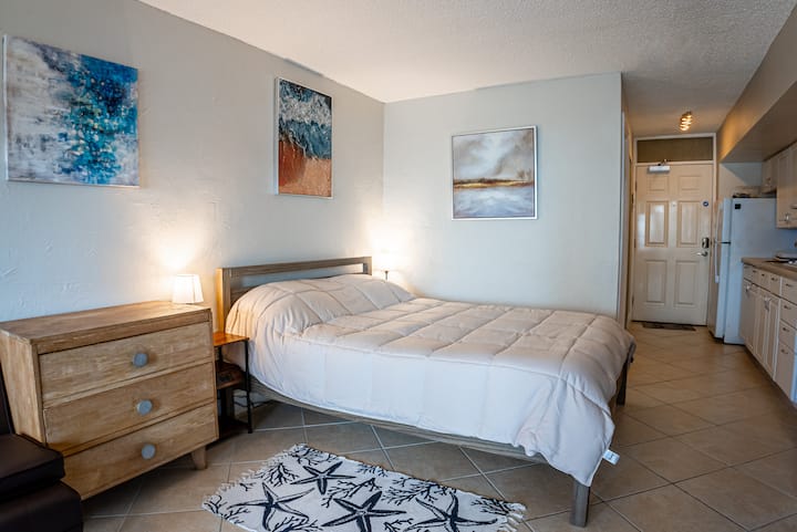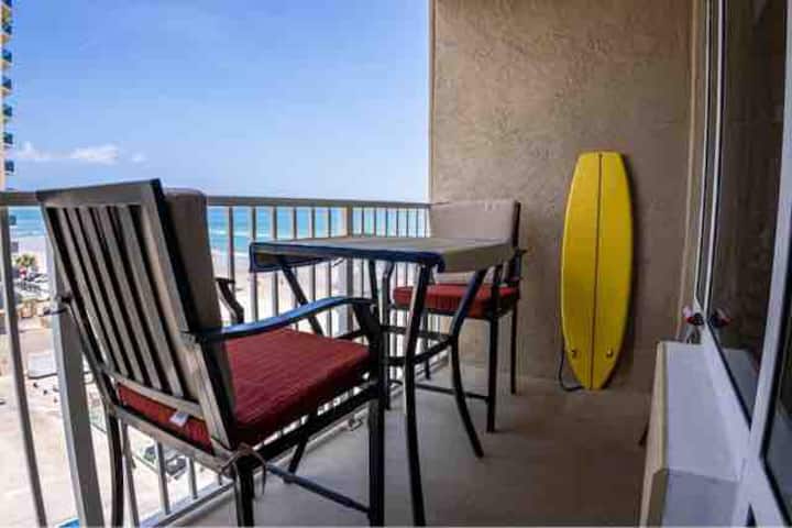 Mirë se vini në Suitën tonë Beachfront me pamje të mahnitshme të oqeanit në Daytona Beach, FL të gjitha vetëm disa hapa larg restoranteve dhe bareve të mahnitshme, Starbucks, CVS, pazar, argëtim dhe më shumë! Ka edhe një mini golf nëpër rrugë të quajtur Ishulli Pirate nëse ndihesh aventurier.