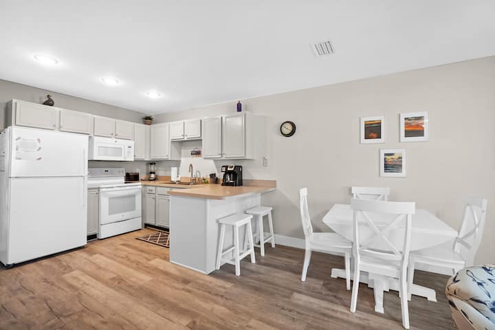 Kuzhinë plotësisht e pajisur me Keurig, aparat kafeje me filtër, raft erëzash dhe të gjitha enët e gatimit për gjithë javën. Sistemi i filtrimit të ujit në të gjithë shtëpinë plus filtri poshtë lavamanit siguron ujë të pastër dhe me shije të shkëlqyer nga çdo rubinet. Lojëra familjare, libra, ventilatorë tavani dhe ajër i kondicionuar qendror kudo.