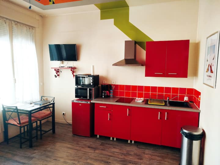 - Dhomë e madhe ndenjjeje me kuzhinë të pajisur me frigorifer, mini furrë, pjatë elektrike qelqi qeramike, mikrovalë, filtër kafeje, Senseo, kazan, toster, pajisje të shtrydhjes.