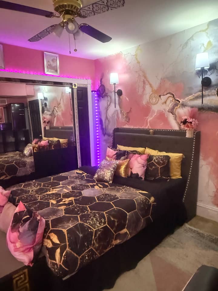 Dhomë mermeri Lux Pink dhe Black në Versace Playhouse