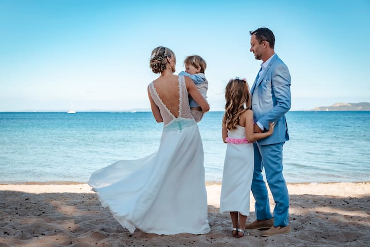 Ceremoni (fetare, civile ose laike), fotografi në grup me të dashurit e tu dhe portrete të nuses dhe dhëndrit në vende ikonike të Nicës.