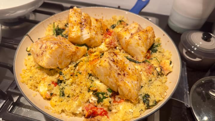Merluç i pjekur me harissa, bulgur me domate qershi, spinaq, borzilok grek dhe feta.