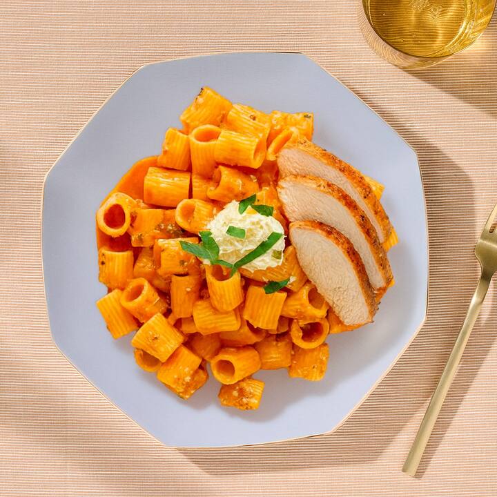 Rigatoni me salcë rozë | Rigatoni në një salcë të butë me krem domatesh me pulë të pjekur, ricotta limoni, parmixhan dhe borzilok.