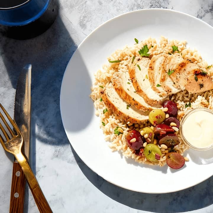 Dorëzuar të freskët në derën tënde nga ora 8:00 deri në 17:00. Gjoks pule i pjekur, i mbushur me djathë dhie kremoze, i shërbyer mbi pilaf orizi të kaftë me salsa rrushi të kuzhinierit Cat Cora. E ëmbël, pikante dhe thellësisht e shijshme, kjo pjatë e frymëzuar nga vendi i verës prek çdo shije. Përfshin 1 pulë të pjekur për vizitor.